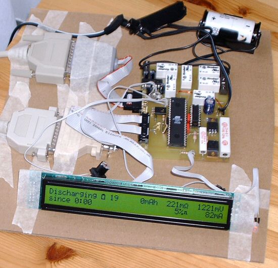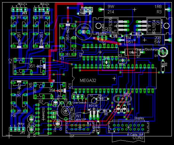 SchaltplanAn den Atmel Microcontroller sind LCD-Display- und Programmieradapter-Anschluß direkt angeschlossen. Rechts oben sieht man Transistoren, die für das Schalten von Lade- und Entladestrom verantwortlich sind. Links unten werden mit einem Leistungstreiber-IC die Relais angesteuert, die für die Auswahl des momentanen Akkus zuständig sind.