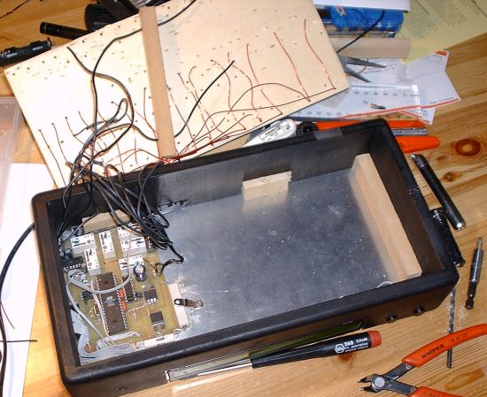 Das fertige Gerät ist in ein Gehäuse aus MDF (Holz) gebaut. Als Staubschutz habe ich eine Plexiglasscheibe zugeschnitten und mit Scharnieren befestigt. Plexiglasscheiben gibt es im Baumarkt zu kaufen.