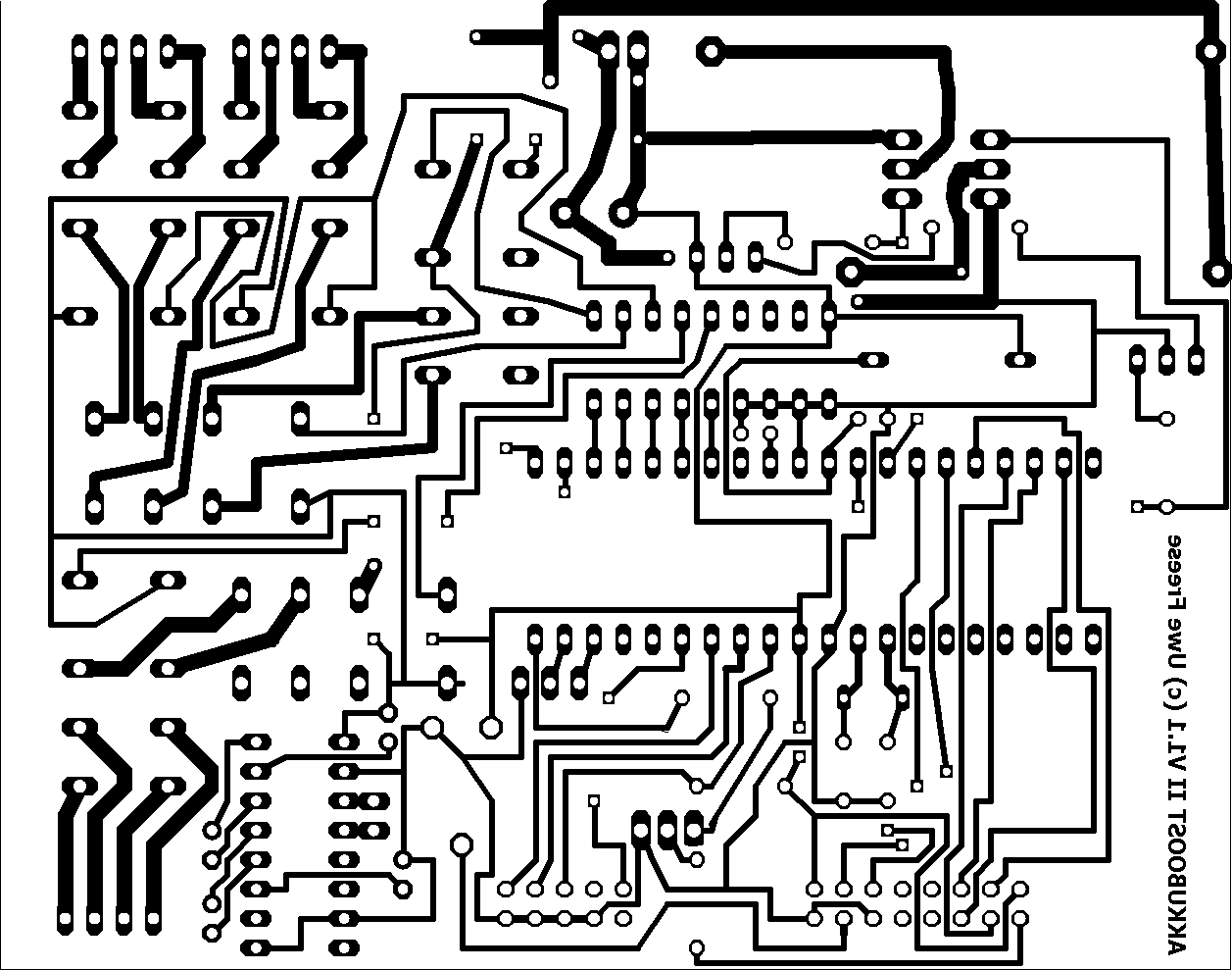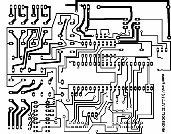 Das Platinenlayout wird zum Ätzen der Platine benötigt. Die Grafik der Hauptplatine muss auf 107mm Breite ausgedruckt werden. (Wenn jemand es mit dieser Version ausprobiert, schreibt er mir bitte den richtigen Wert, wenn es nicht paßt!) Das Layout der zweiten Platine sollte mit 150 dpi ausgedruckt werden.