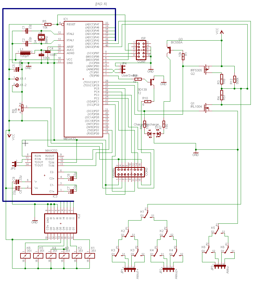 SchaltplanAn den Atmel Microcontroller sind LCD-Display- und Programmieradapter-Anschluß direkt angeschlossen. Rechts oben sieht man Transistoren, die für das Schalten von Lade- und Entladestrom verantwortlich sind. Links unten werden mit einem Leistungstreiber-IC die Relais angesteuert, die für die Auswahl des momentanen Akkus zuständig sind.